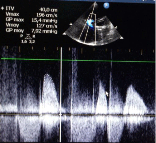 According to hemodynamique measurements, once inflation was complete, the mean pressure gradient was reduced to 5 mmHg. The right atrial pressure dropped from 46 mmHg to 23mmHg. Post procedure transthoracic echo cardiography showed that mean gradient was reduced from 12 mmHg to 6 mmHg (Figure 3). The tricuspid régurgitation was inchanged. The patient tolerated the procedure well.