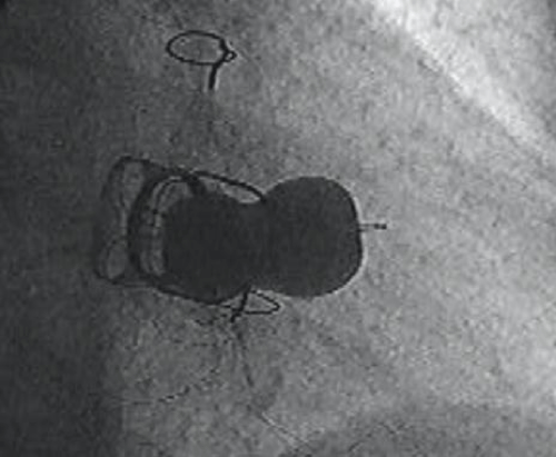We performed percutaneous transcatheter ballon valvuloplasty via the femoral approach, inflating an Inouie ballon n° 30mm (Figure 1). We use an inouie ballon because of our extensive experience in percutaneous valve dilatation with this device.