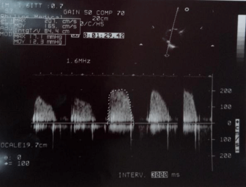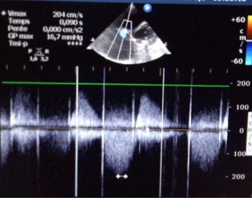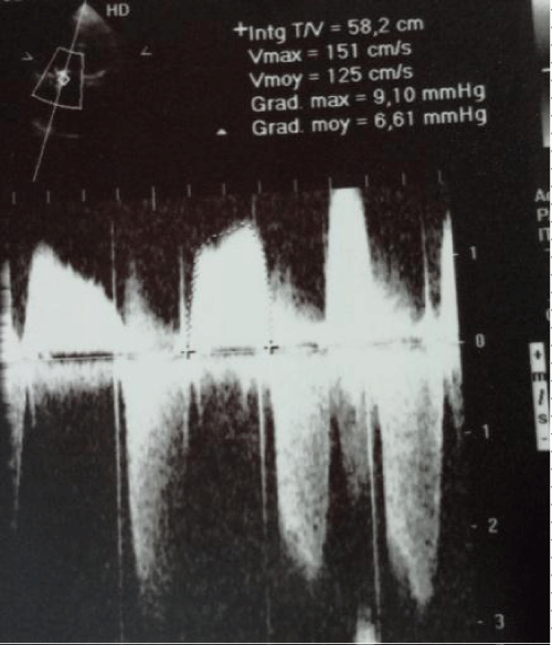 According to hemodynamique measurements, once inflation was complete, the mean pressure gradient was reduced to 5 mmHg. The right atrial pressure dropped from 46 mmHg to 23mmHg. Post procedure transthoracic echo cardiography showed that mean gradient was reduced from 12 mmHg to 6 mmHg (Figure 3). The tricuspid régurgitation was inchanged. The patient tolerated the procedure well.
