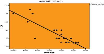 There was a highly significant negative correlation between post-operative Ejection fraction and pre-operative GLS (R=-0.901, P<0.001), preoperative DF (r=-0.852, p<0.001) and pre-operative E/è (r=-0.806, p<0.001). In addition, there was significant negative correlation between post-operative Ejection fraction and ageing (r=-0.601, p<0.05) while there was a significant positive correlation between post-operative Ejection fraction pre-operative Ejection fraction (r=0.641, p<0.05) (Table 3, Figure 1).